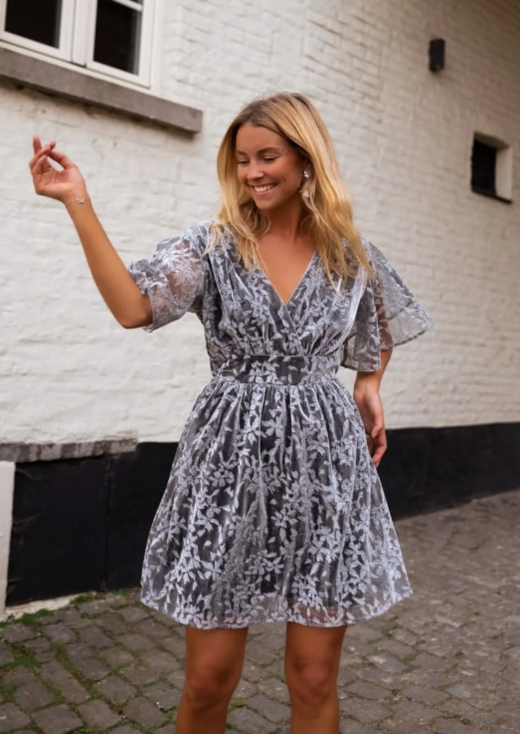 New Robe Celisse Argentée – Motifs à Fleurs – Col V – DoubléeEasy Clothes Femme Robes