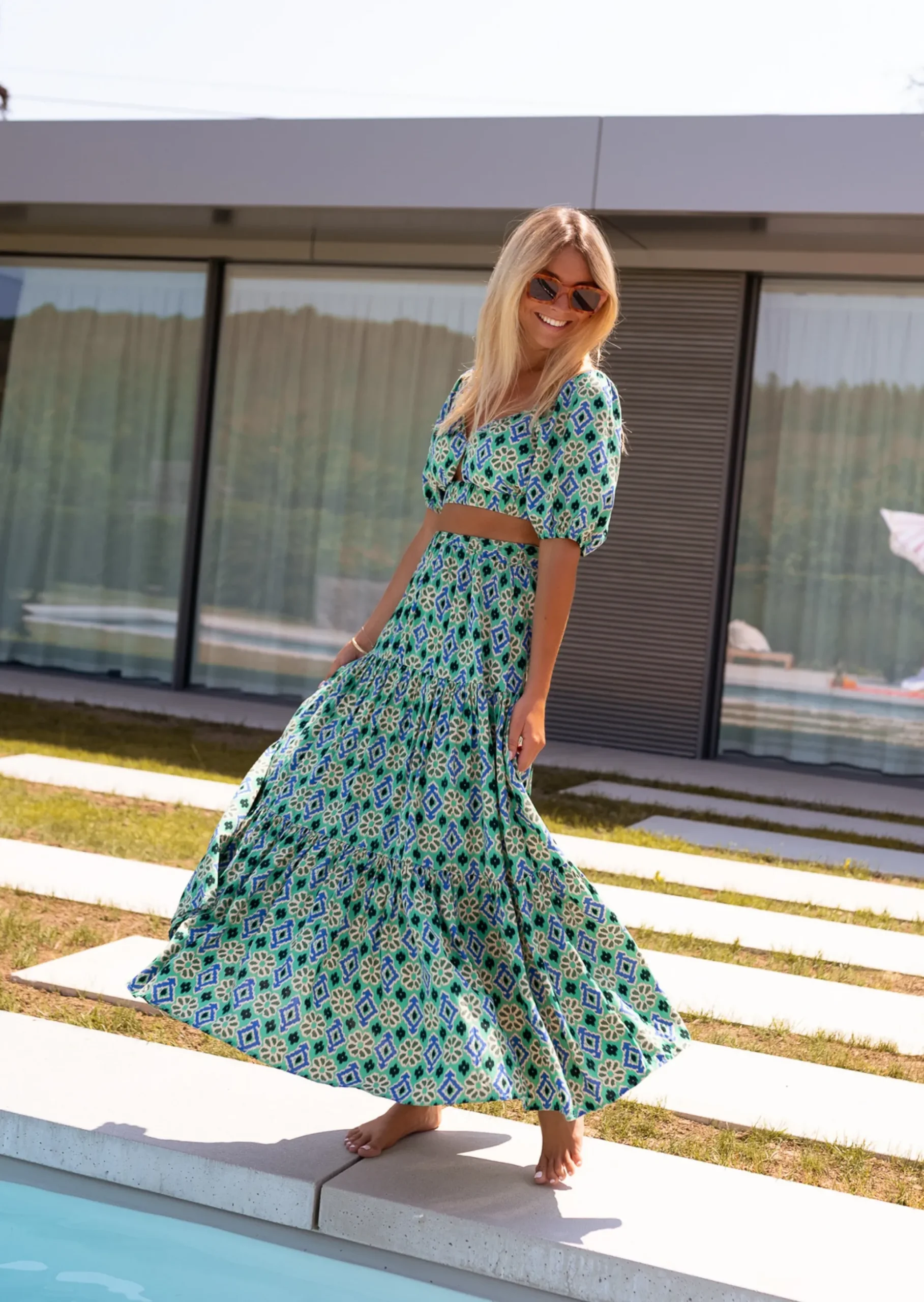- Notre modèle porte le top Vanessa vert à motifs